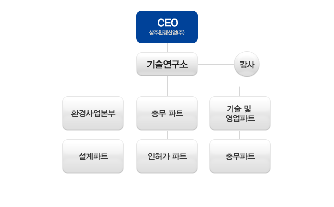 기술연구소 감사 1 환경사업본부 부사장 1 총무 파트 경리 1 기술 및 영업 파트 기술이사 1 영업이사 1 설계 파트 상무 1 이사 1 부장 1 차장 1 과장 2 인허가 파트 과장 1 주임 1 생산 파트 공장장 1 제작소장 1 현장소장 1 전기소장 1