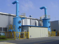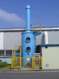 WET SCRUBBER(습식 세정설비)는 가스와 세정수와의 접촉시간을 최대한 높이기 위해 탑안에 비표면적이 높은 플라스틱등의 충진물을 충전시켜 흡수제는 탑의 상부로 넣고, 유해가스는 하부에서 공급하여 액적, 액막 기포등에 의해 함진가스를 세정하여 입자에 부착, 입자상호간의 응집을 촉진시켜 직접 가스의 흐름으로부터 입자를 분리시키는 장치이다. 함진가스에 함유된 분진 및 악취, 산성가스를 중화 제거하며 친수성 분진은 액적에 포집되어 제거되고 유해가스는 물과 반응하여 산성수가 되어 알카리액에 의해 중화처리 된다. 산성가스의 제거율이 우수하며 백연방지를 위해 DEMISTER가 설치되기도 한다.
